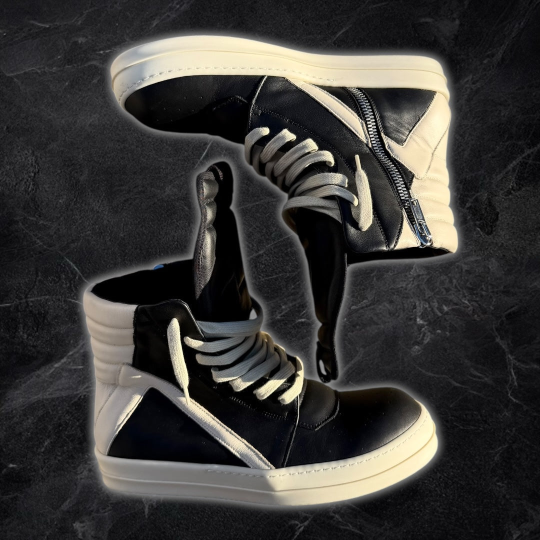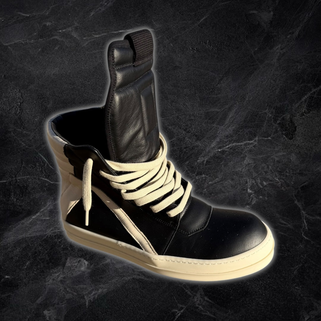• RICK OWENS SS26 TEMPLE GEOBASKET IN BLACK/MILK/MILK FULL GRAIN COW LEATHER