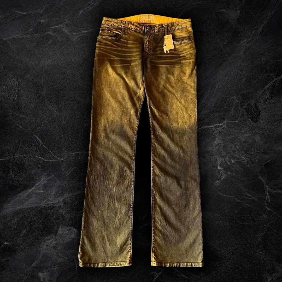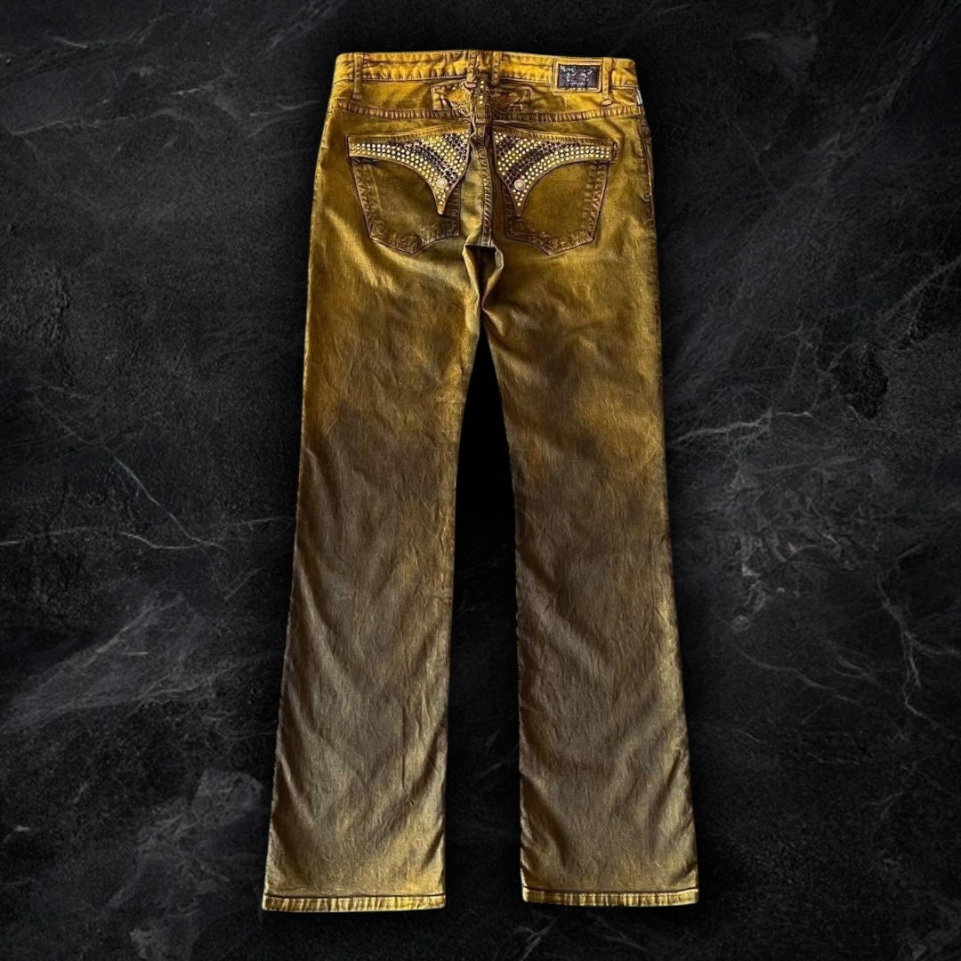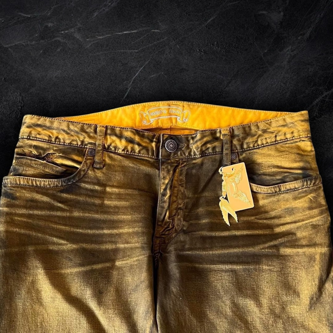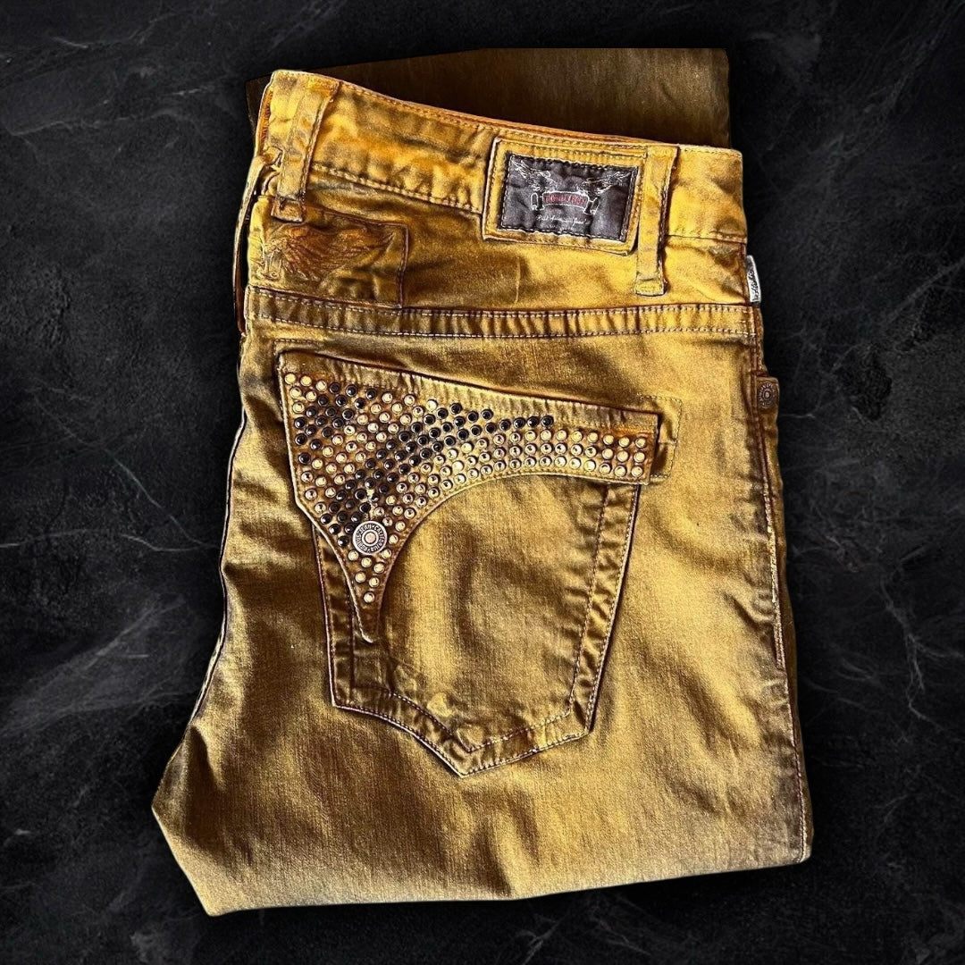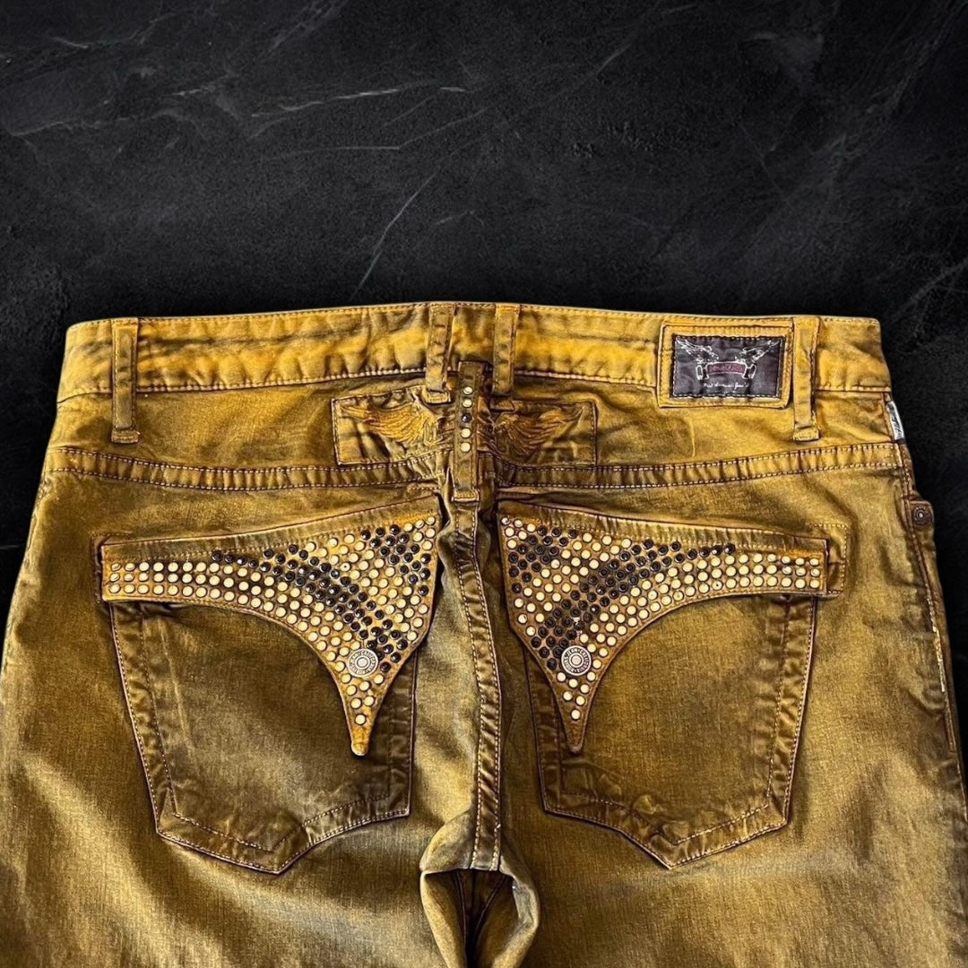 “DUST YELLOW” beautiful yellow robins with a dark wash all over, 3D creases and fully iced out flaps with black and gold swarvorski crystals! brand new with tags so the condition is as good as it gets! they fit perfectly with long legs for a ruffled/stacked look.