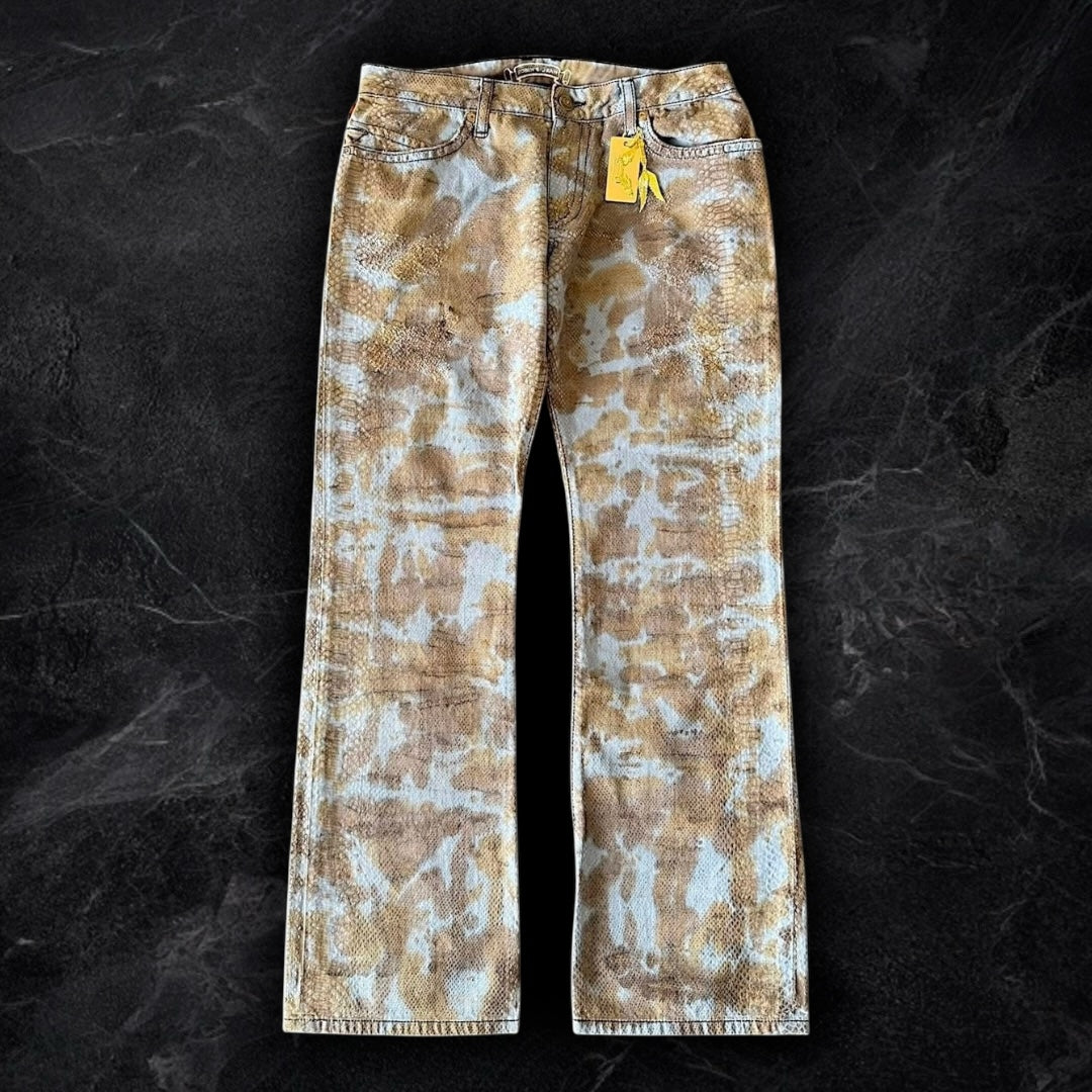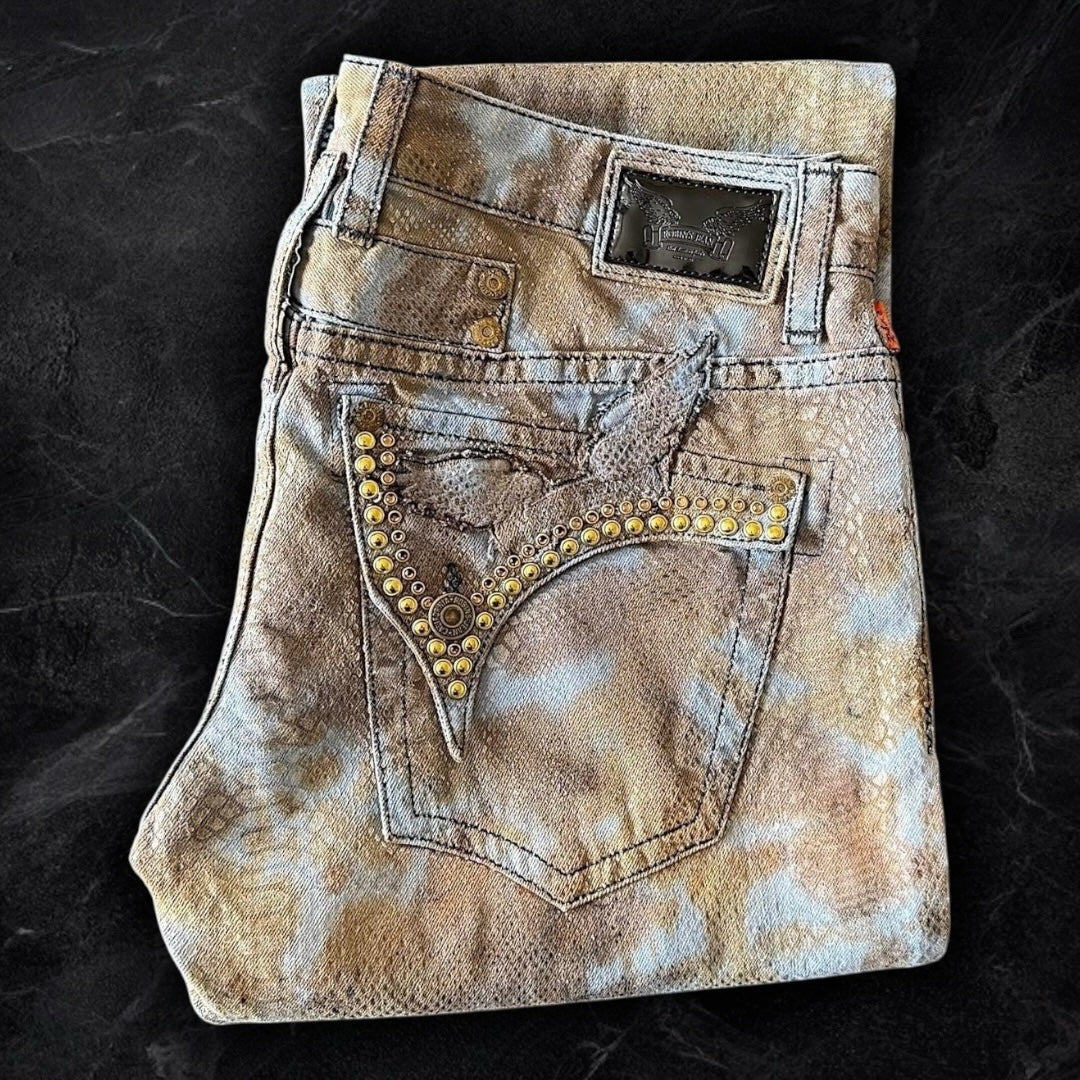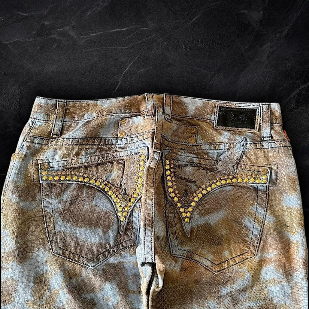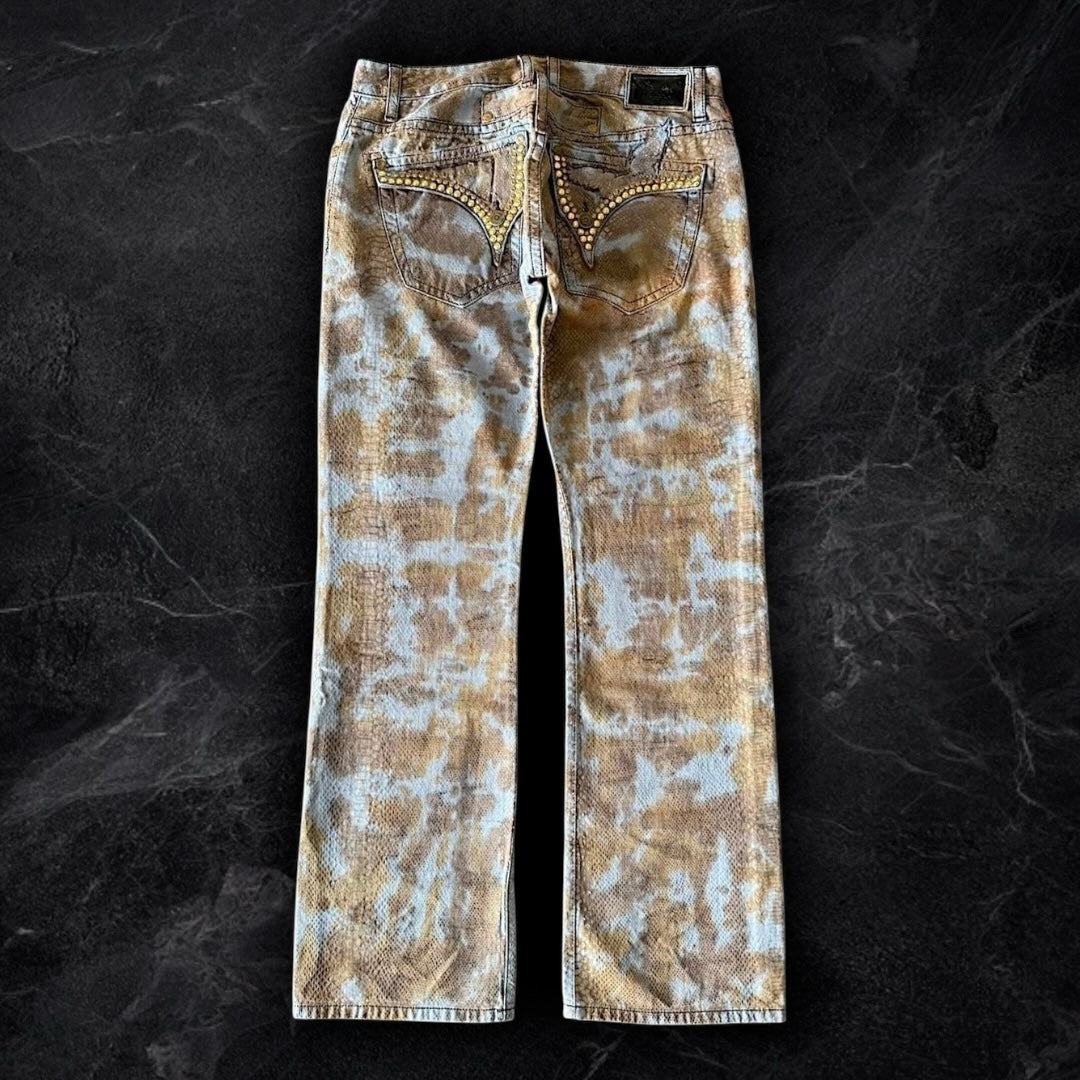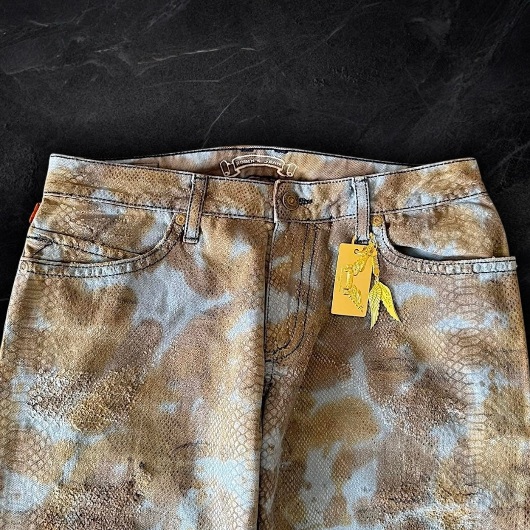 mud wash denim with blue areas and a snakeskin finish. the flaps have a single row of golden studs, smokey topaz swarvorski crystals and a robinsjean embroidery. condition is as good as it gets! brand new with tags. bootcut fit.