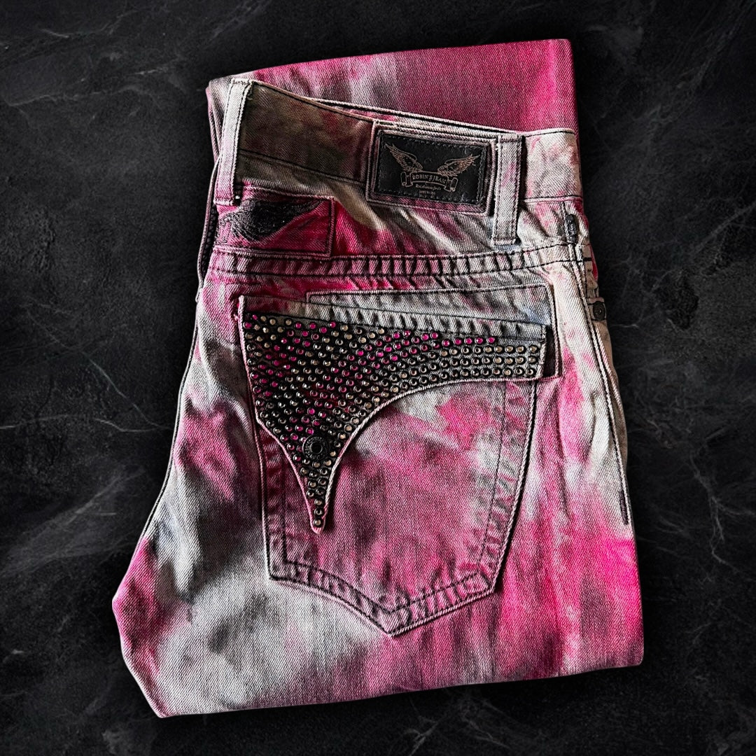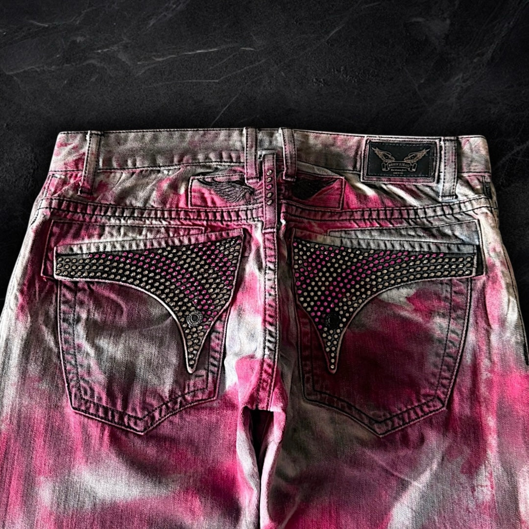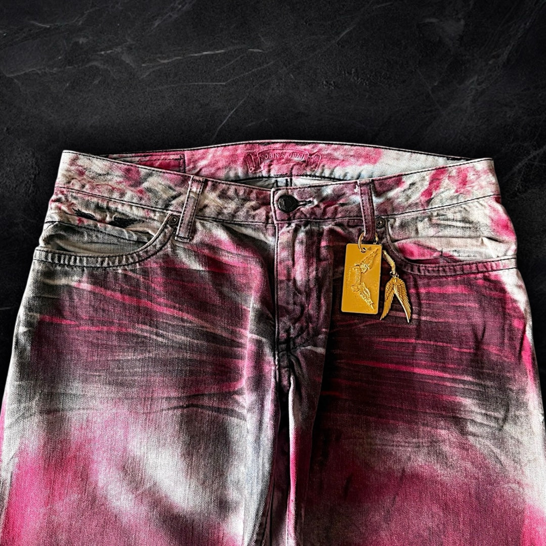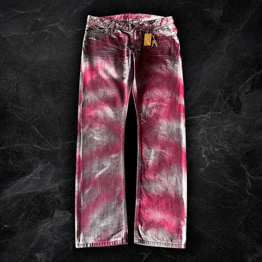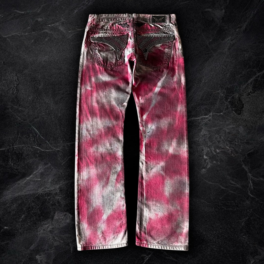 OG pair of Robins Jeans! white denim jeans with red/pink spray paint over the top with grey/black spray paint in areas for shading. crazy whiskering on the front pockets! fully iced out flaps with clear and pink swarvorski crystals. condition is as good as it gets! only flaw is small wear on some of the buttons. won't find another pair this pink and bright, all others are completely washed out. classic straight leg fit.