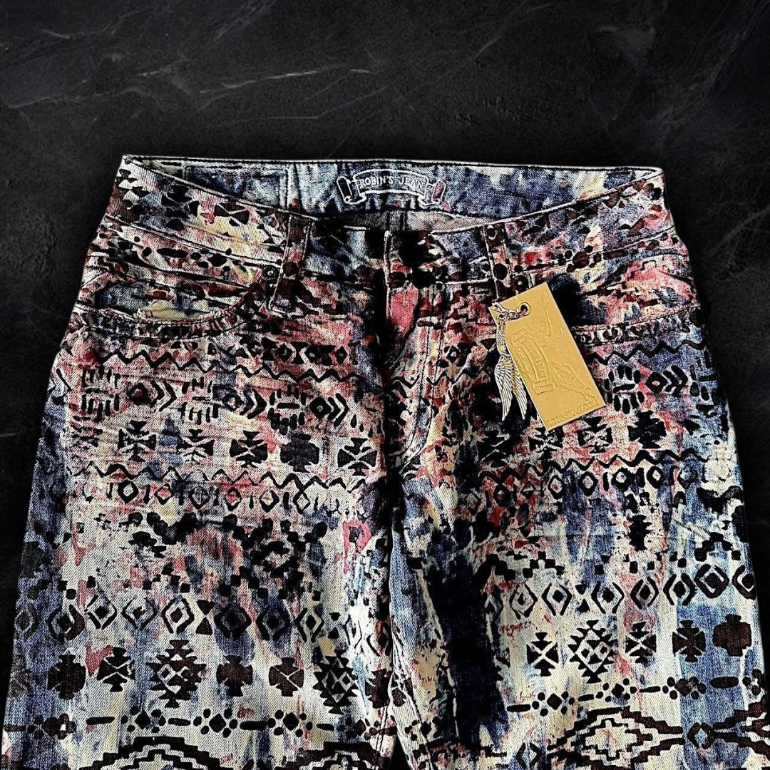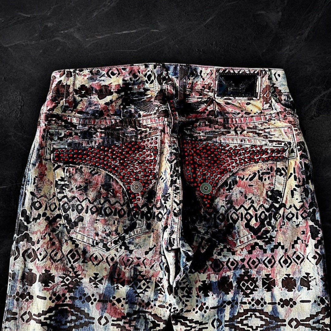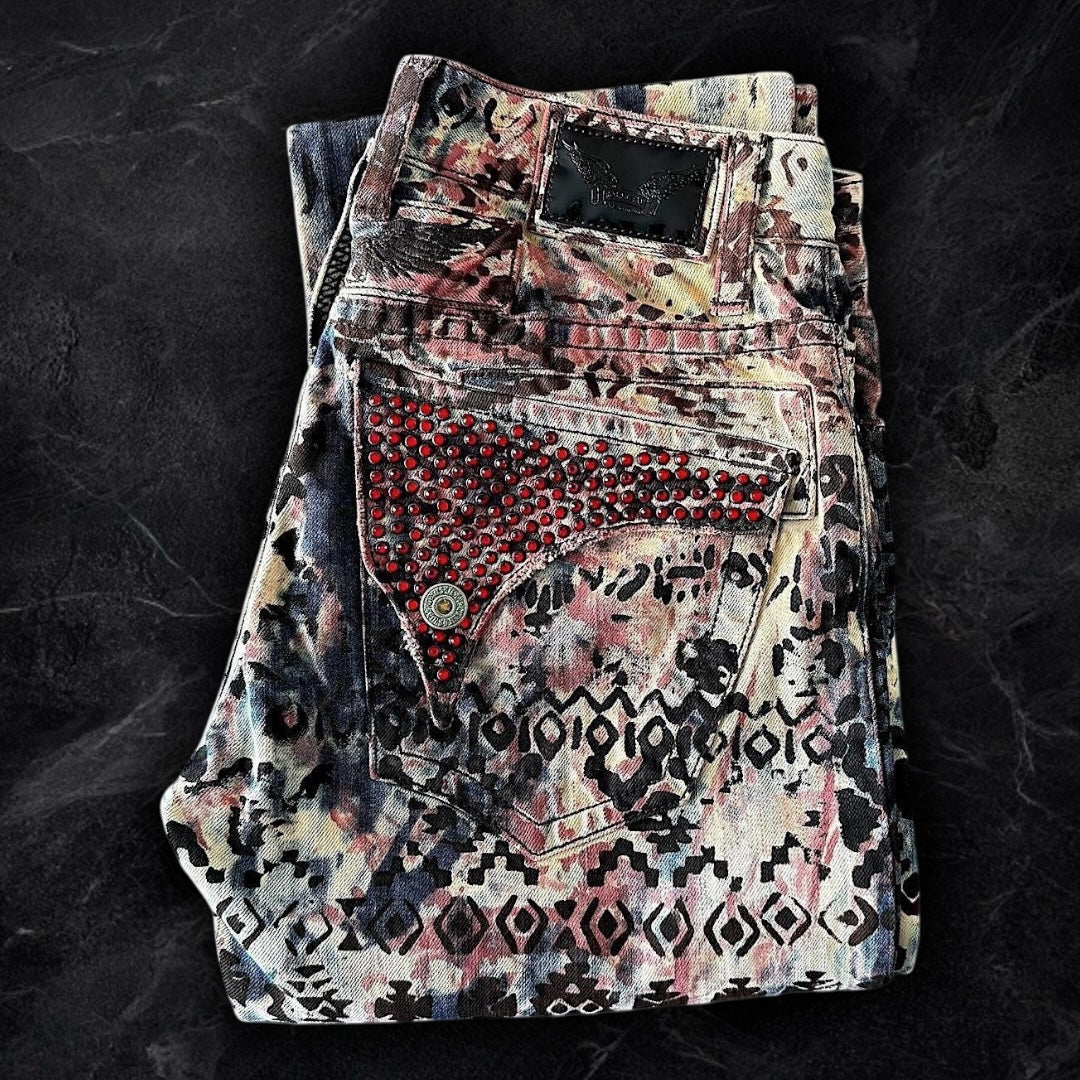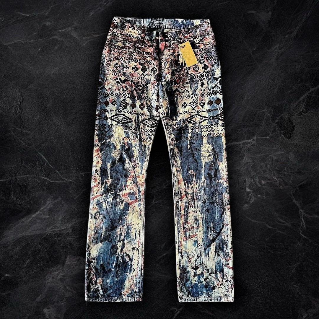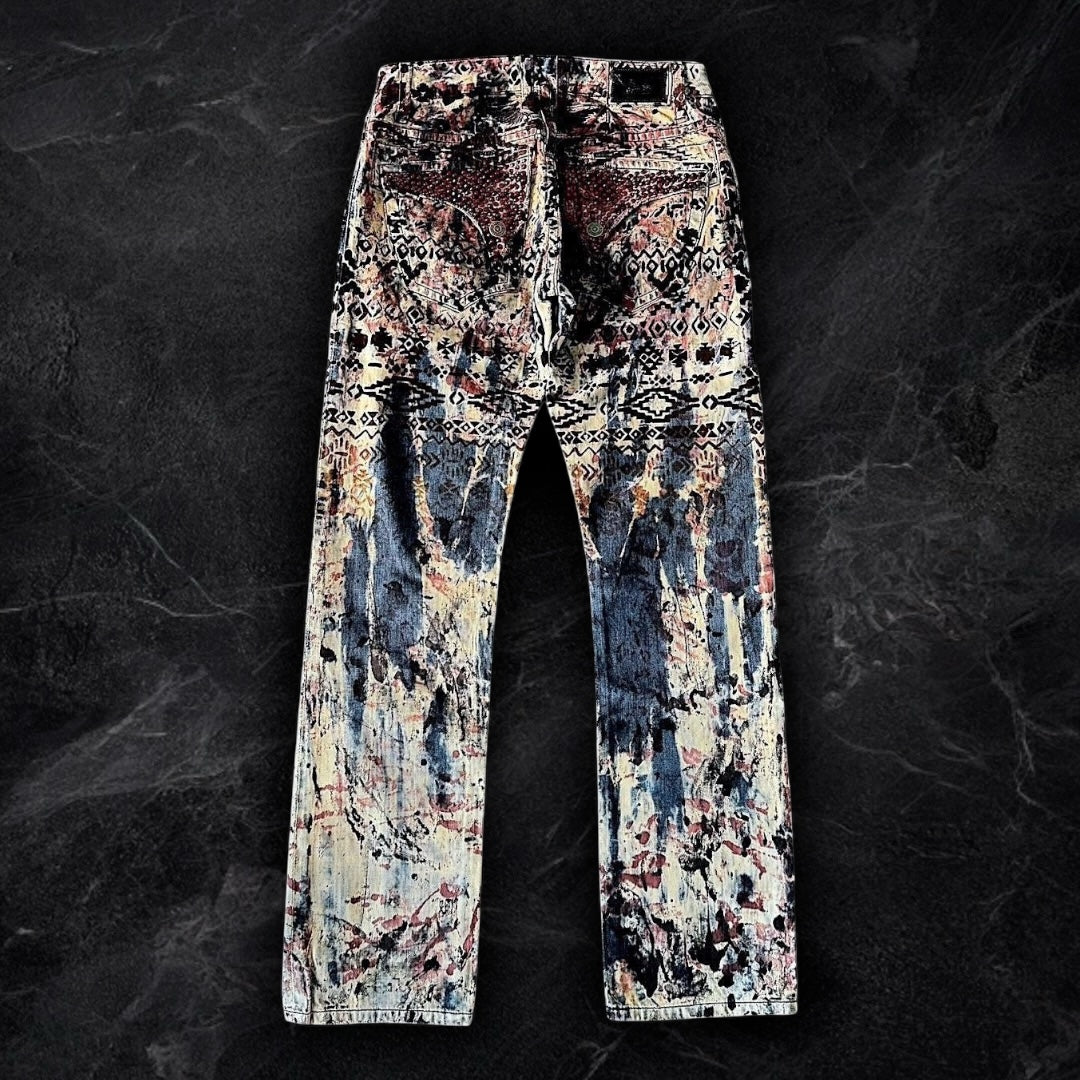 these jeans are insane. navy denim with bleach all over, paint marks and a native american print all over. fully iced flaps with red swarvorski crystals. these are brand new with tags so the condition is as good as it gets. straight leg fit.