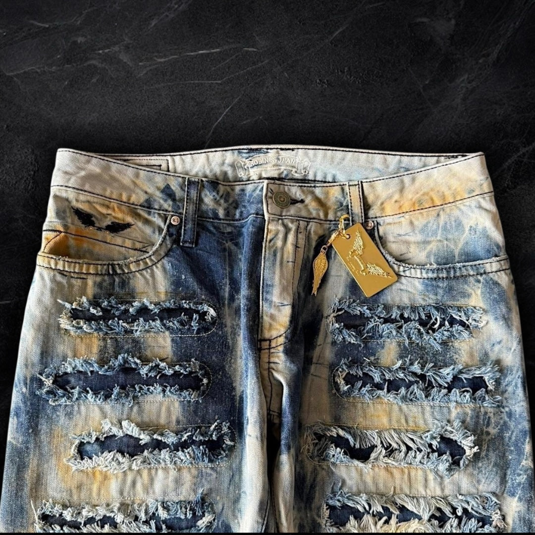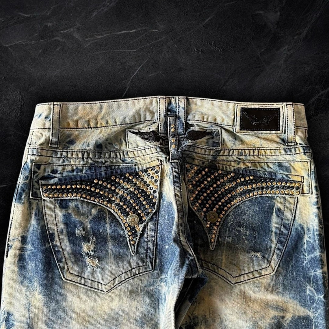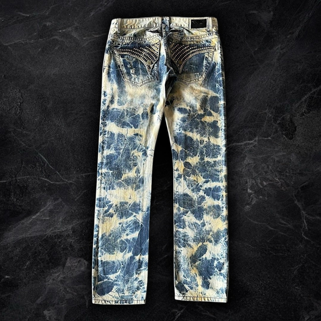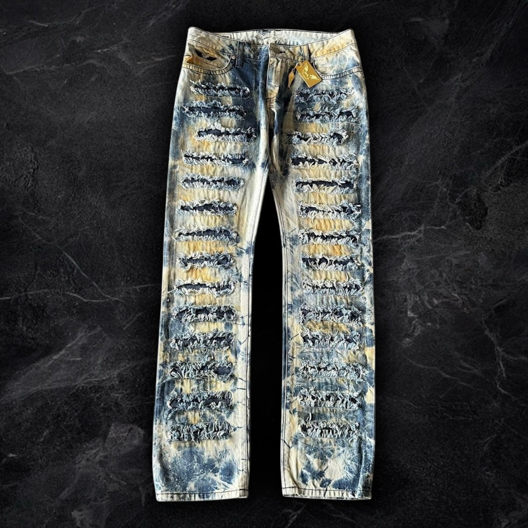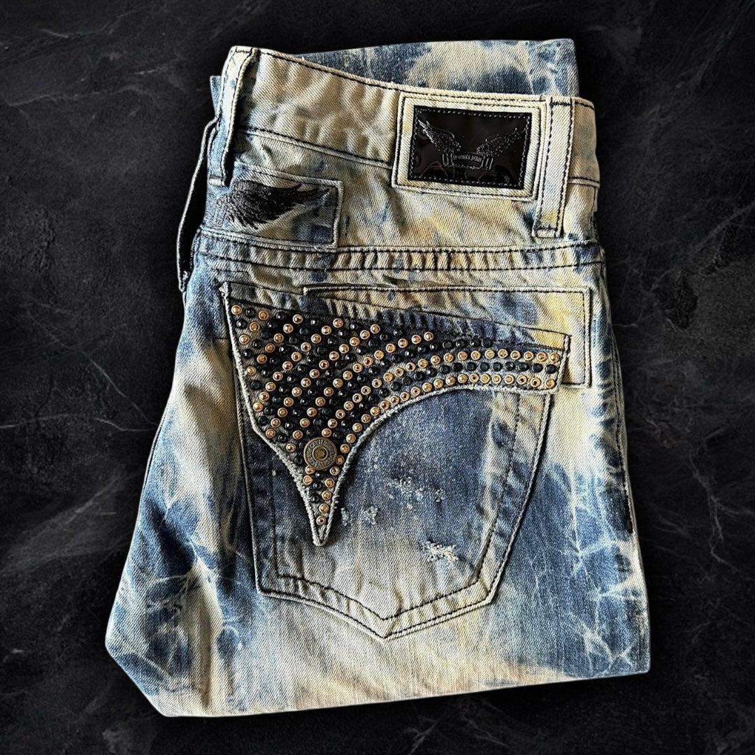 insane wash on these! blue and white ocean look with yellow accents. factory distressing on the back pockets and front with denim backing underneath. fully iced out flaps with blue and gold swarvorski crystals. condition is as good as it gets! brand new with tags. slim leg fit, 8 inch leg opening.
